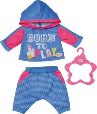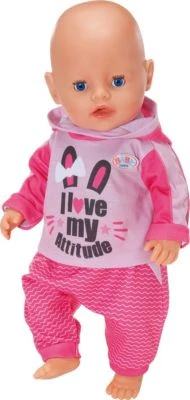 BABY born ist bereit für den Sport und mit diesem Set von Zapf Creation ist sie gleich bestens ausgestattet. Die Kombination aus Hose und Kapuzen-Sweatshirt ist bequem und sieht auch noch toll aus. In Pink oder Blau macht BABY born bei jeder Sportart eine tolle Figur, aber auch zum Entspannen eignet sich dieses Outfit.