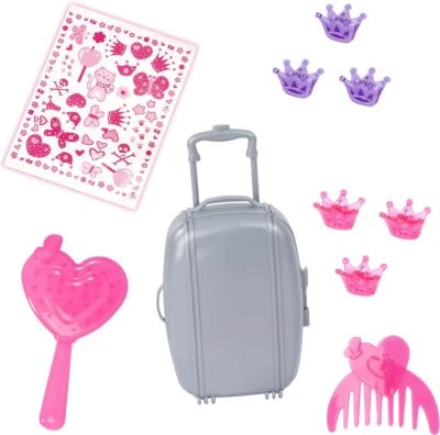 Zu ihrem Zubehör gehört neben den Haarklammern, Bürste und Kamm außerdem ein Reisekoffer, in dem man Charlenes Accessoires verstauen und auch prima Urlaub spielen kann.