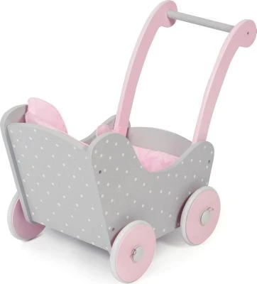 Mit diesem süßen Wagen können kleine Puppenmamas ihre Lieblinge auf tolle Ausfahrten mitnehmen! Dank dem weichen Stoffbezug kann die Puppe bequem sitzen. Leichtlaufende Räder mit Stahlachsen machen so einige Abenteuer mit. Der Schieber animiert auch perfekt zum Laufen Lernen. Viel Spaß im Mini-Format!