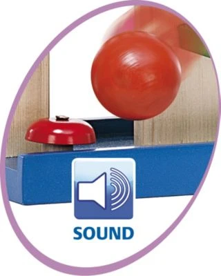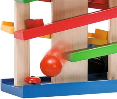 Dieses kleine Rollbahnhaus mit drei farbigen Kugeln besteht aus fünf Holzlaufbahnen, die Kugeln laufen sogar um die Ecke! Die Ankunft wird durch das Bimmeln eines kleinen Glöckchens belohnt.