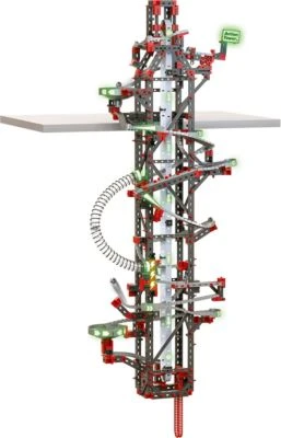 Einfach und schnell im Aufbau, für große Höhenunterschiede bestens geeignet, effizient und schick in der Optik! Ergänzt wird die coole Optik von einem Aufkleberbogen, der bei Dunkelheit leuchtet! Es können Blitze, Pfeile und vieles mehr angeklebt werden. So wird die Kugelbahn im abgedunkelten Kinderzimmer zum absoluten Highlight! Das ist aber noch nicht alles, oder? Der Antrieb erfolgt manuell über eine Kette oder zusätzlich mit Motor. Die gefederte Spannrolle am Aufzug sorgt für gleichmäßige Spannung des Bandes und störungsfreien Betrieb. Zudem gibt es einen Kugelsammler, bei dem die Anzahl der Kugeln beliebig eingestellt werden kann. Ein Flexschlauch mit drehbaren Enden sorgt für einen einfachen und flexiblen Einbau ins Modell. Die hängende Kugelbahn hält noch weitere Raffinessen parat: Ein Trichter fängt fliegende Kugeln auf, über eine Schanze wird ordentlich abgehoben ? alles in allem eine super unterhaltsame Bahn und dann noch in neuer, cooler Farbgebung, nämlich in Silber!