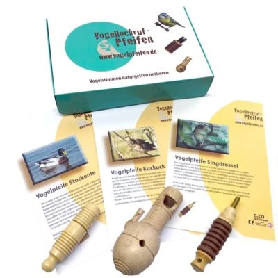 Vogelpfeifen Set mit 3 bekannten Vogelstimmen.Singdrossel ,Stockente, Kuckuck.Incl Präsentkarton, Anleitung in deutsch