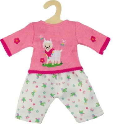 Süße Kombi für modische Puppen. Bei diesem Outfit sind die Alpakas los! Der Strickpulli ist mit einem niedlichen Motiv versehen und die dazugehörige Hose ist besonders bequem und mit inem bunten Muster versehen. Zwei perfekte Kleidungsstücke, um bequem und schick durch den Alltag zu kommen.