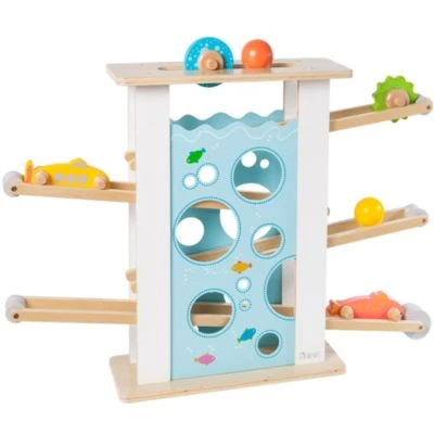Spielen und Lernen – mit der howa KugelbahnAus dem Weg! Jetzt startet das Wettrennen mit der howa Kugelbahn. Diese ist ganz im Design einer Unterwasserwelt gehalten. So können Kinder einen Seestern, einen Fisch, bunte Kugeln, eine Blubberblase sowie ein Unterwasserfahrzeug an den Start schicken. Durch das Aufnehmen und Ablegen der Holzelemente trainieren die Kleinen gezielt die Motorik sowie die Auge-Hand-Koordination. Auch die verschiedenfarbigen Kugeln sowie die unterschiedlichen Rollelemente sorgen für jede Menge Entdeckerspaß. Die Teilnehmer, die vorerst nicht ins Rennen geschickt werden, können ganz oben auf der Kugelbahn abgelegt werden. Das wilde Rennen auf der vier-stufigen Fahrbahn, können die Kleinen durch die lustigen Blubberblasen beobachten.