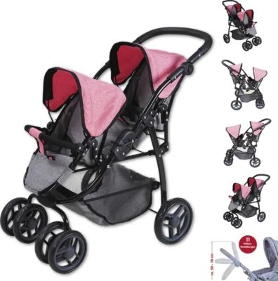 Mit dem praktischen Zwillingspuppenwagen „Milo“ von KnorrToys können Kinder gleich mit zwei ihrer Puppen eine tolle Spazierfahrt machen. Ausgestattet ist das schicke Modell mit einem verstellbaren Verdeck, einem Einkaufskorb sowie zwei Sitzen mit Anschnallgurt. Für einen angenehmen Fahrkomfort sorgt die Softummantelung des höhenverstellbaren Schiebers.