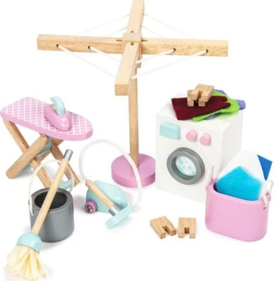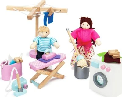Die Puppenfamilie bekommt heute eine komplett neue Ausstattung für den Hauswirtschaftsraum im Puppenhaus. Mit dem Puppenhaus Waschraum Set von Le Toy Van kommen allerhand sinnvolle Alltagshelfer für die Puppenfamilie. Mit dabei ist eine Wäschespinne mit Wäscheklammern, Waschmaschine, Bügelbrett und natürlich auch Wäschestücke. Außerdem, falls das Puppenhaus gesaugt und gewischt werden muss, ein Staubsauger, ein Eimerchen und ein Wischmopp. Weitere Zubehörteile sorgen für kreativen Spielespaß im Puppenhaus. Die farbenfrohen Möbel aus Holz sind robust und bieten langanhaltende Freude.