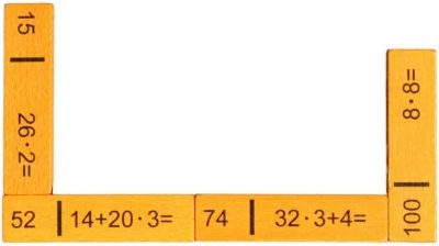 Mit diesem Rechendomino können Kinder die Addition, Multiplikation, Division und Subtraktion spielerisch bis zur Zahl 100 üben. Alles ist aus Holz gefertigt und farbig gestaltet mit Farben die auf Wasserbasis und lösungsmittelfrei basieren. Gefertigt wird alles in einer Firma die aus dem Erzgebirge kommt. Die 40 Dominosteine sind alle in einer stabilen Holzkiste 20 x 16,5 x 3 cm mit Deckel verpackt. Kombinierbar mit Rechendomino I und III