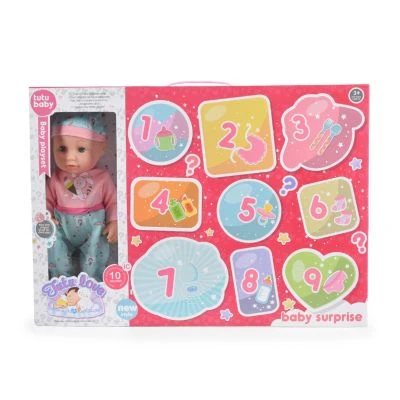 Puppe 35 cm 9 teiliges Zubehör Trinkflasche, Lätzchen, Löffel, Gabel, Teller, Schnuller mit Kette, Schuhe, Töpfchen, Windel, Puder, Seife Puppe kann trinken und pinkeln Puppe macht 10 verschiedene Geräusche Altersempfehlung ab 3 Jahre soziale Kompetenzen werden entwickelt