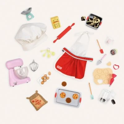 Dieses Set ist der Traum einer jeden kleinen Bäckerin! Auch deine Puppen von Our Generation lieben es, gemeinsam leckere Kekse zu backen! Mit der stylischen Schürze machen sie dabei auch noch eine ausgezeichnete Figur und können sich nach Herzenslust in der Küche austoben.