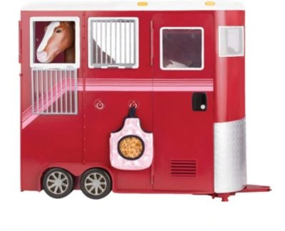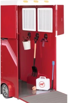 Mit dem Our Generation Pferdeanhänger tauchst du tief in diePferdewelt ein. Der rote Wagen bietet Platz für eins deiner tollen Pferde und ein Fohlen und bringt noch dazu eine Menge Accessoires mit, die im Stall nützlich sein werden. Alle Fenster und Türen lassen sich öffnen, damit du noch mehr Platz zum Spielen hast. Der Sattel, eine Mistgabel, verschiedene Bürsten, ein Handschuh und ein Siegerpokal sind nur ein paar der Zubehörteile, die enthalten sind. Lass deiner Fantasie freien Lauf und erlebe spannende Geschichten. Der tolle Pferdeanhänger mit dem reichhaltigen Zubehör fördert die Kreativität und Fantasie ihres Kindes.