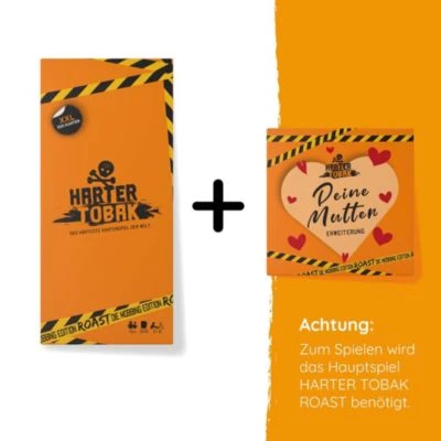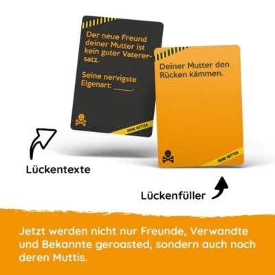 Ergänzend zu den 500 Karten von Harter Tobak Roast, erhaltet ihr mit der Deine Mutter-Erweiterung 35 Lückenfüller und 45 Lückentexte, die sich alle um Mama drehen.