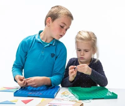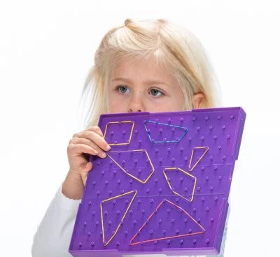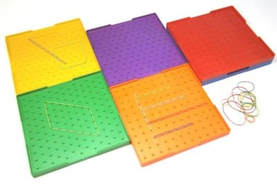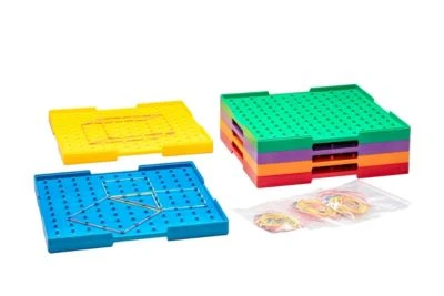 23 x 23 cm. Stapelbar. Der Satz beinhaltet 6 Geobretter (081615.X00) in 6 Farben. Eine Seite quadratische, andere Seite isometrische Zapfenanordnung.Mit je ca. 25 Gummiringen in 6 Farben und 4 Größen. Mit 24 Legebeispielen.