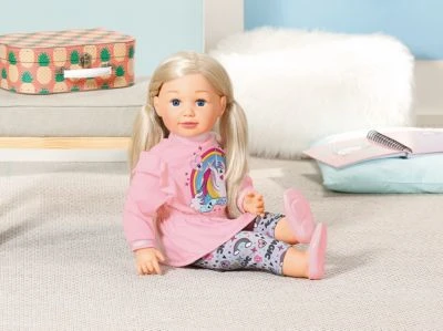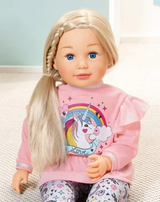 Sally ist die coole kleine Freundin mit der man spielen, kuscheln und Geheimnisse teilen kann. Die 63 Zentimeter große Puppe mit dem weichen Stoffkörper mag lässige Outfits und kann auch mal richtige Kinderkleidung anprobieren. Am liebsten trägt sie das Langarmshirt mit dem bunten Einhorn-Print auf der Front. Die rosa Ballerinas und die verspielte Hose passen bestens dazu. Ihre langen blonden Haare lassen sich zu tollen neuen Frisuren verändern.